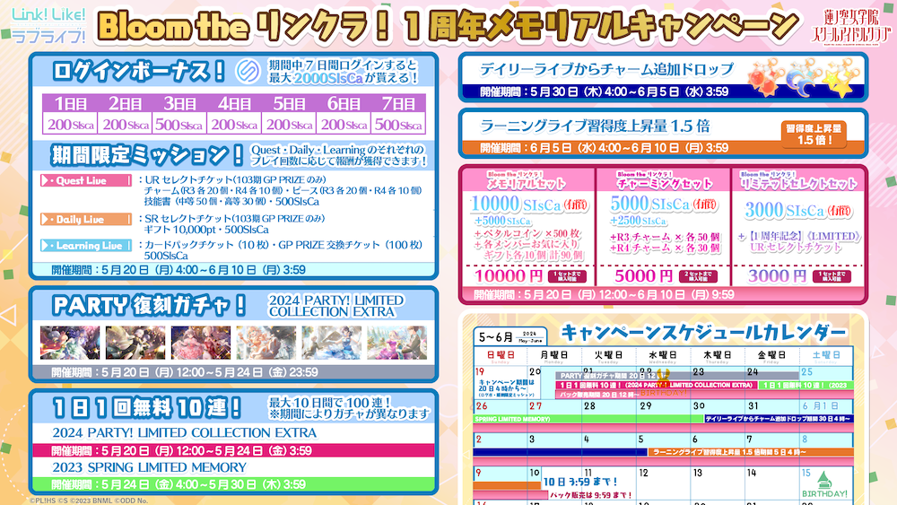 おかげさまで「リンクラ」は2024年5月20日(月)で1周年を迎えました。日頃より「リンクラ」をプレイいただいております皆様に感謝の気持ちを込め、様々なキャンペーンを開催いたします!また、蓮ノ空女学院スクールアイドルクラブの公式YouTubeチャンネル及び公式X(旧Twitter)においても様々な企画を開催いたします。